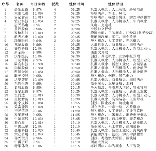 36、舒华体育(10.00%)涨停原因:海峡两岸、华为概念、人工智能。