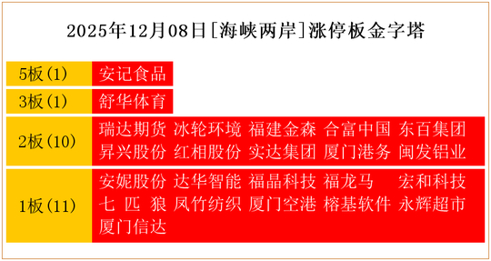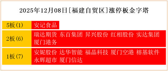 一共有14支个股涨停。其中,安记食品5板;瑞达期货、东百集团、昇兴股份、红相股份、实达集团、厦门港务2板;安妮股份、达华智能、福晶科技、厦门空港、榕基软件、永辉超市、厦门信达1板。