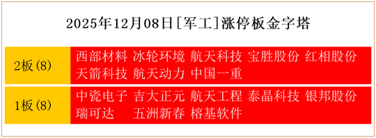 一共有16支个股涨停。其中,西部材料、冰轮环境、航天科技、宝胜股份、红相股份、天箭科技、航天动力、中国一重2板;中瓷电子、吉大正元、航天工程、泰晶科技、银邦股份、瑞可达、五洲新春、榕基软件1板。