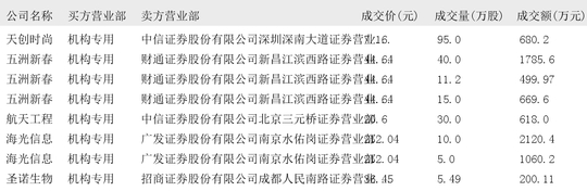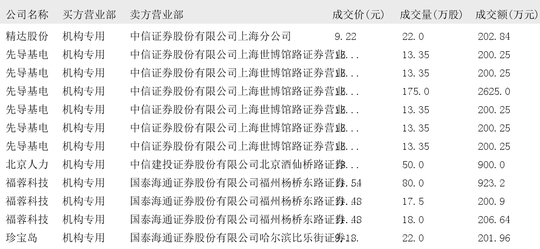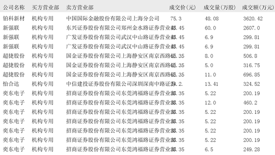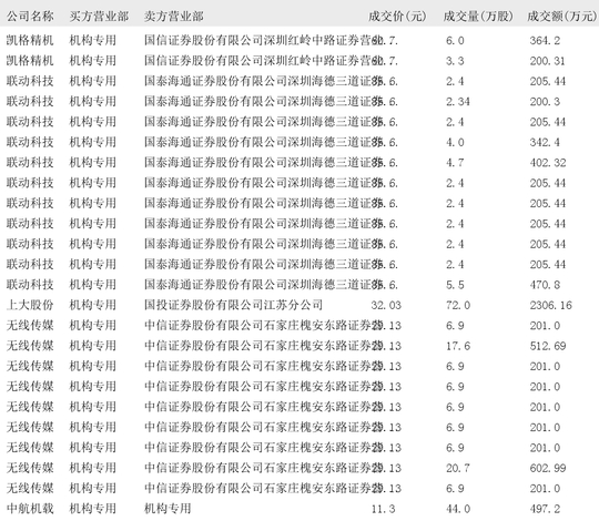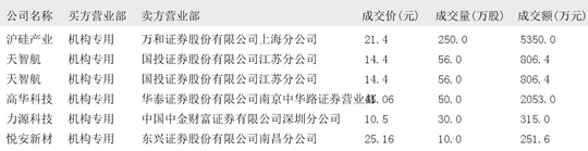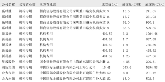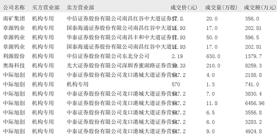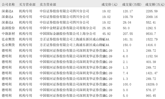 今日大宗交易榜单中出现机构买入席位的个股为:深桑达A、盐湖股份、中旗新材、弘业期货、德明利、南矿集团、章源钨业、利源股份、奥海科技、中际旭创、赢时胜、新易盛、星云股份、朗新集团、金力永磁、铂科新材、新强联、超捷股份、怡合达、奕东电子、凯格精机、联动科技、上大股份、无线传媒、中航机载、精达股份、先导基电、北京人力、福蓉科技、珍宝岛、天创时尚、五洲新春、航天工程、海光信息、圣诺生物、沪硅产业、天智航、高华科技、力源科技、悦安新材、宏远股份。