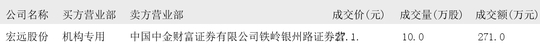 宏远股份今日机构专用买入席位为1席,成交量共10.00万股,成交额共271.00万元,成交额占流通市值比例为47.48%。