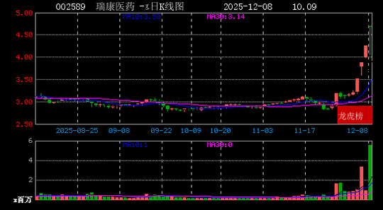 截止收盘,瑞康医药报收4.69元/股,涨幅10.09%,成交量551万手,成交额25.16亿元,换手率40.34%。今日4板。