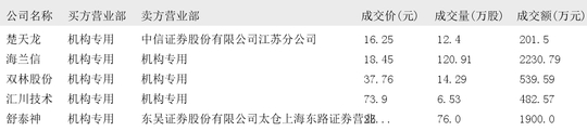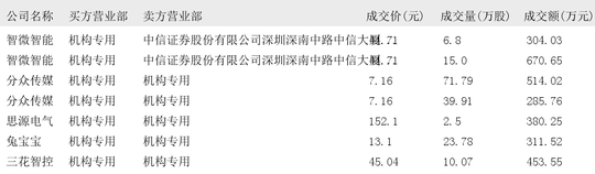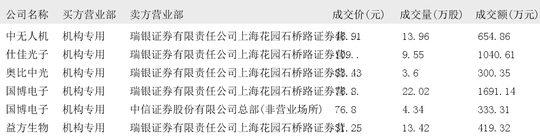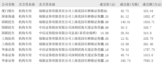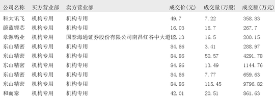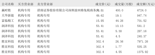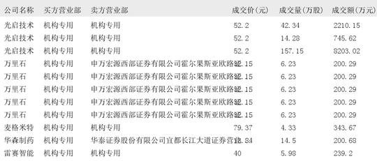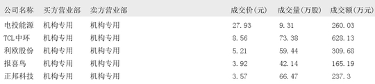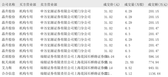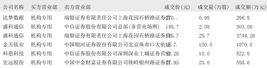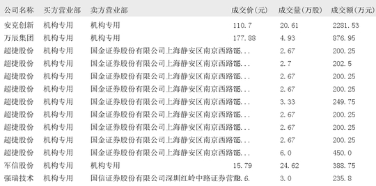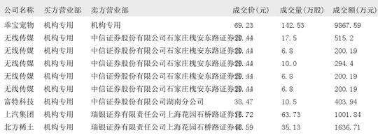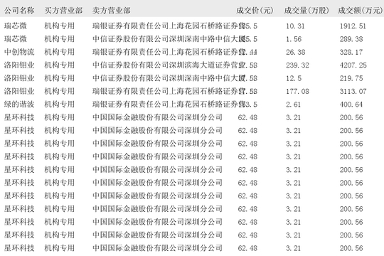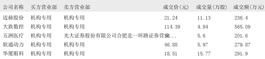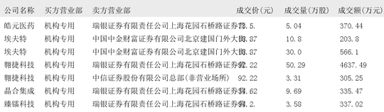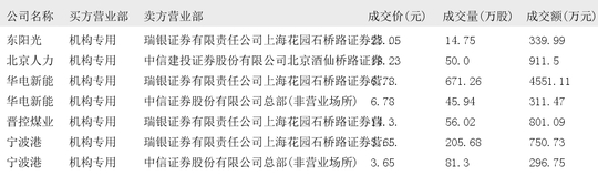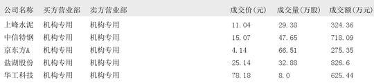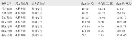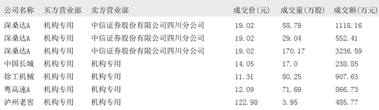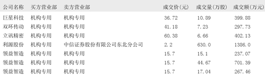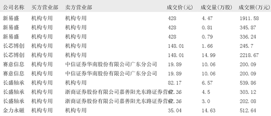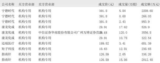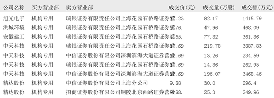 今日大宗交易榜单中出现机构买入席位的个股为:深桑达A、中国长城、徐工机械、粤高速A、泸州老窖、上峰水泥、中信特钢、京东方A、盐湖股份、华工科技、智微智能、分众传媒、思源电气、兔宝宝、三花智控、电投能源、TCL中环、利欧股份、报喜鸟、正邦科技、科大讯飞、蔚蓝锂芯、章源钨业、东山精密、和而泰、巨星科技、双环传动、立讯精密、利源股份、领益智造、光启技术、万里石、麦格米特、华森制药、雷赛智能、楚天龙、海兰信、双林股份、汇川技术、舒泰神、科大智能、光线传媒、常山药业、阳光电源、中际旭创、赢时胜、天华新能、富临精工、润泽科技、胜宏科技、新易盛、长芯博创、赛意信息、长盛轴承、金力永磁、宁德时代、康龙化成、迈瑞医疗、矩子科技、指南针、安克创新、万辰集团、超捷股份、军信股份、强瑞技术、迈赫股份、大族数控、五洲医疗、软通动力、华厦眼科、乖宝宠物、无线传媒、富特科技、上汽集团、北方稀土、旭光电子、洪城环境、安徽建工、中天科技、精达股份、东阳光、北京人力、华电新能、晋控煤业、宁波港、厦门银行、国泰海通、国联民生、上海医药、华泰证券、凤凰传媒、可川科技、圣龙股份、华勤技术、航天工程、瑞芯微、中创物流、洛阳钼业、绿的谐波、星环科技、传音控股、龙芯中科、热景生物、华大智造、沪硅产业、皓元医药、埃夫特、翱捷科技、晶合集成、臻镭科技、中无人机、仕佳光子、奥比中光、国博电子、益方生物、晶升股份、芯原股份、航天南湖、艾力斯、合合信息、达梦数据、盛科通信、金天钛业、科思科技、宏远股份。