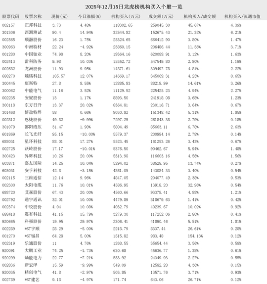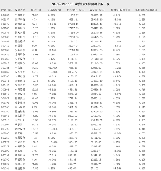 2025年12月15日盘后龙虎榜公开信息中,有74支股票出现了机构的身影。其中,有36支股票出现了机构买入,38支股票出现了机构卖出。