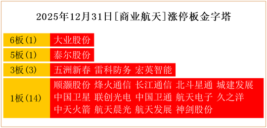 一共有15支个股涨停。其中,泰尔股份5板;五洲新春、雷科防务3板;北斗星通、中国卫星、联创光电、中国卫通、王子新材、航天电子、久之洋、航发科技、中天火箭、航天晨光、航天发展、神剑股份1板。