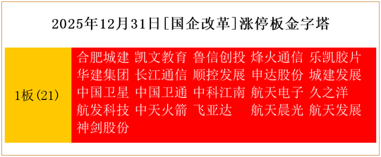 一共有21支个股涨停。其中,合肥城建、凯文教育、鲁信创投、烽火通信、乐凯胶片、华建集团、长江通信、顺控发展、申达股份、城建发展、中国卫星、中国卫通、中科江南、航天电子、久之洋、航发科技、中天火箭、飞亚达、航天晨光、航天发展、神剑股份1板。