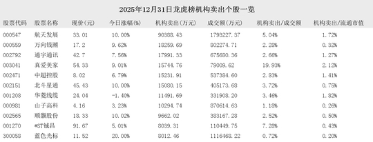 2025年12月31日盘后龙虎榜公开信息中,有31支股票出现了机构的身影。其中,有11支股票出现了机构买入,20支股票出现了机构卖出。