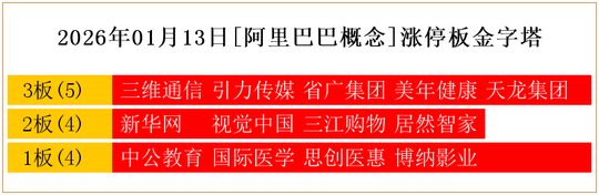 一共有13支个股涨停。其中,三维通信、引力传媒、省广集团、美年健康、天龙集团3板;新华网、视觉中国、三江购物、居然智家2板;中公教育、国际医学、思创医惠、博纳影业1板。