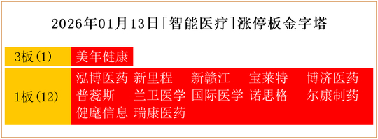 一共有13支个股涨停。其中,美年健康3板;泓博医药、新里程、新赣江、宝莱特、博济医药、普蕊斯、兰卫医学、国际医学、诺思格、尔康制药、健麾信息、瑞康医药1板。