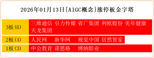 一共有13支个股涨停。其中,三维通信、引力传媒、省广集团、利欧股份、美年健康、天龙集团3板;人民网、新华网、视觉中国、居然智家2板;中公教育、诺思格、博纳影业1板。