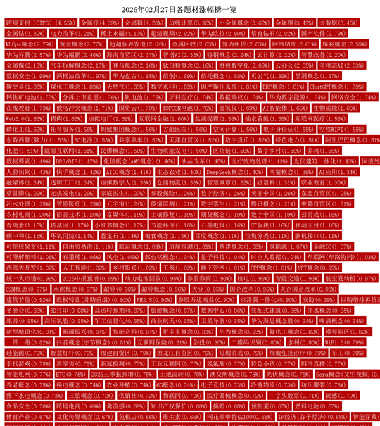 今日涨幅居前的题材概念有:跨境支付(CIPS)(4.55%)、金属锌(4.39%)、金属铅(4.29%)、边缘计算(3.96%)、小金属概念(3.62%)、金属铜(3.49%)、大数据(3.45%)、金属钴(3.32%)、电力改革(3.21%)、稀土永磁(3.13%)。