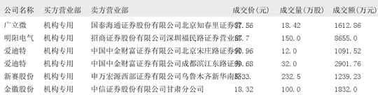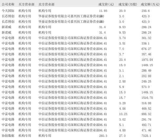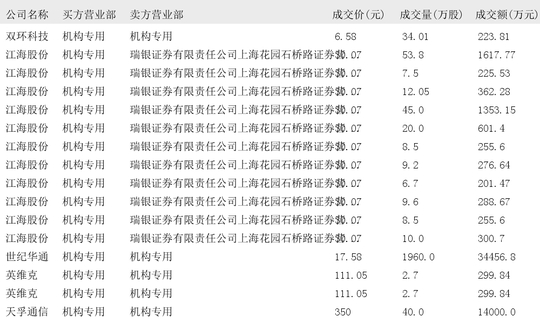 今日大宗交易榜单中出现机构买入席位的个股为:双环科技、江海股份、世纪华通、英维克、天孚通信、今天国际、长芯博创、新诺威、中富电路、协创数据、广立微、明阳电气、爱迪特、新赛股份、金徽股份、索宝蛋白、三美股份。