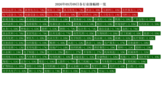 今日涨幅居前的行业有:电信运营(3.15%)、新型电力(2.74%)、煤炭(2.24%)、水力发电(1.72%)、黄金(1.46%)、互联网(1.4%)、软件服务(1.07%)、电气设备(0.71%)、电脑设备(0.68%)、铝(0.57%)。