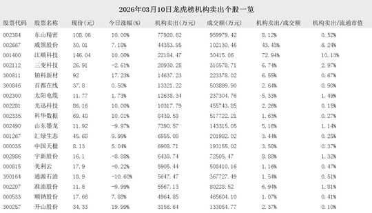 2026年03月10日盘后龙虎榜公开信息中,有43支股票出现了机构的身影。其中,有18支股票出现了机构买入,25支股票出现了机构卖出。