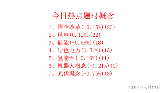 今日的热点题材概念有:国企改革、风电、储能、绿色电力、氢能源、机器人概念、光伏概念。