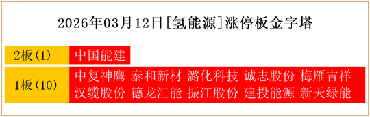 一共有11支个股涨停。其中,中国能建2板;中复神鹰、泰和新材、潞化科技、诚志股份、梅雁吉祥、汉缆股份、德龙汇能、振江股份、建投能源、新天绿能1板。