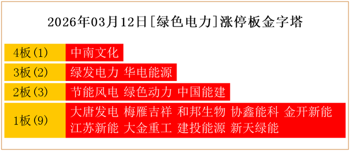 一共有15支个股涨停。其中,中南文化4板;绿发电力、华电能源3板;节能风电、绿色动力、中国能建2板;大唐发电、梅雁吉祥、和邦生物、协鑫能科、金开新能、江苏新能、大金重工、建投能源、新天绿能1板。