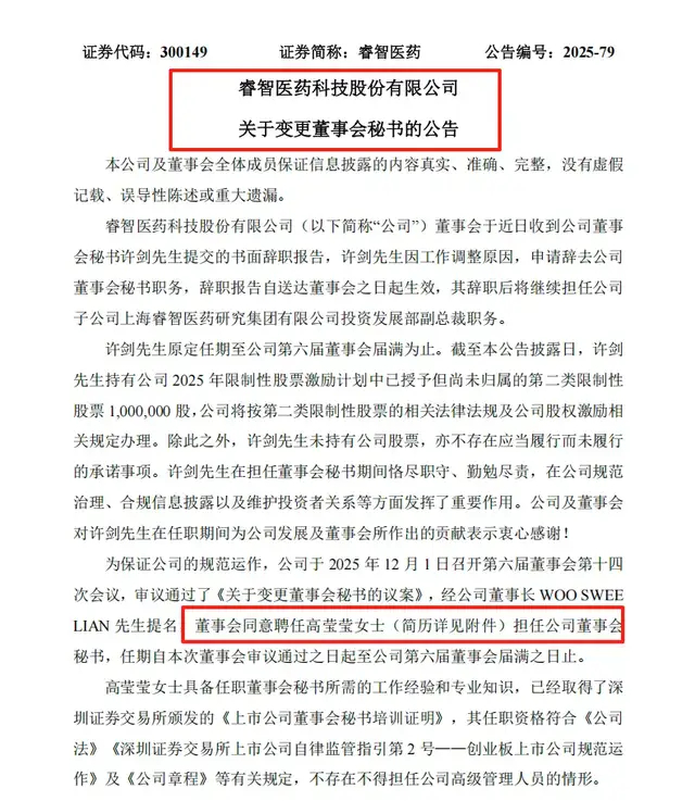 尽管公告强调其已取得董秘培训证明,具备任职资格,但缺乏医药行业积淀与资本市场实操经验的短板,仍让不少投资者提出质疑:“生物药研发生产是高度专业的领域,董秘岗位关乎信息披露准确性与资本运作效率,跨界新人能否胜任?”