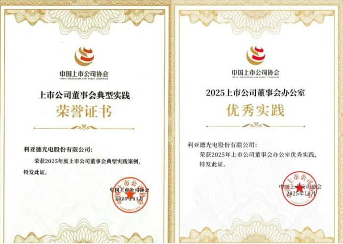 近日,利亚德再添重磅荣誉:凭借卓越的治理能力与创新实践,一举斩获中国上市公司协会(以下简称 “中上协”)“2025年度上市公司董事会典型实践案例”、“2025年度上市公司董事会办公室优秀实践” 两大奖项,标志着监管机构、资本市场及行业协会对利亚德现代化公司治理体系的高度认可,为科技企业治理升级树立了实践典范。