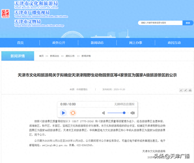 按照《旅游景区质量等级划分》(GB/T 17775-2024)和《旅游景区质量等级管理办法》,经各旅游景区自愿申报,滨海新区、和平区、东丽区、宝坻区文化和旅游局初评与推荐,市文化和旅游局组织综合评定,拟确定天津津翔野生动物园景区为国家4A级旅游景区,天津庆王府旅游景区、华利集团电力文化旅游景区和小辛码头旅游景区为国家3A级旅游景区,现予公示。
