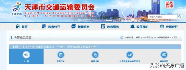 “十五五”时期是天津市深入实施“十项行动”、纵深推进港产城融合发展、建设世界一流智慧绿色枢纽港口的重要时期。科学编制好我市港口“十五五”发展规划,既是落实交通强市建设要求、服务京津冀协同发展战略的具体举措,也是充分发挥天津港的优势和作用、打造我国北方地区联通国内国际双循环重要战略支点的关键支撑,对推动港产城深度融合、助力适港产业发展具有重要意义。为提升规划的科学性、前瞻性、可操作性,确保规划谋深谋实,坚持“问计于企业,问计于民,问计于市场”,切实把社会期盼、群众智慧、基层经验、企业需求吸收到规划中,现面向社会公开征集意见建议,诚挚邀请社会各界建言献策。有关事项公告如下:
