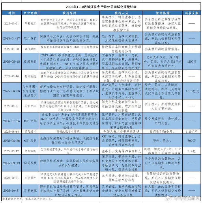 东方日升尚属轻微,也并非光伏行业孤例。今年以来,光伏企业频频被证监会行政处罚,华夏能源网统计发现,今年前10个月,有14家光伏企业被证监会监管、出具警示函或处以重罚,涉及高管超百人,处罚资金合计21.83亿元(详见表格),远超2024年22家光伏企业合计近3.5亿元的罚单总额。