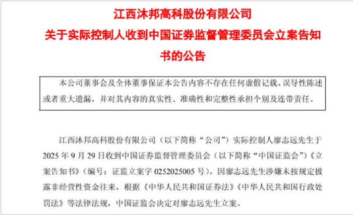 最终,这些问题都被监管部门揪了出来。8月6日,上交所对沐邦高科,控股股东江西沐邦新能源控股有限公司,实控人廖志远,关联方江西豪安能源科技有限公司、张忠安,时任财务总监汤晓春,时任董事会秘书刘毅予以了公开谴责。9月29日晚,证监会对廖志远立案调查。