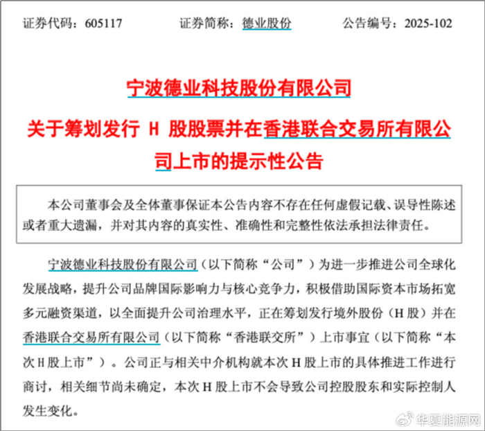 华夏能源网获悉,11月13日,逆变器龙头德业股份(SH:605117)发布公告称,公司正在筹划发行境外股份(H股)并在香港联交所上市事宜。