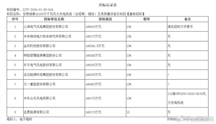 标段三规划装机容量700MW,要求单机容量6.X MW,风机数量不超过112台。该标段共有9家整机商入围,分别为电气风电、中车株洲所、金风科技、明阳智能、东方风电、运达股份、三一重能、中车山东风电、远景能源。其中,最高报价为14.97亿元,投标单位为电气风电;最低报价为14.92亿元,投标单位为中车山东风电和远景能源。
