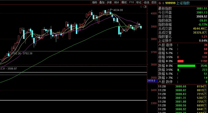 今上午主力机构更是集体打压权重股,510300ETF从周一的4.754元,跌到上午低点4.658元,跌2%。五大银行股普跌2%左右,六大权重股也一起下跌,遂让大盘探至3877点。印证了我在3900上下20点震荡的判断。