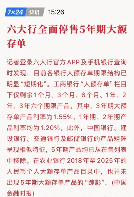 现在,5年期大额存单在六大行直接全面停售了,只能在转让列表里面找到少量5年期产品,而下一个目标,3年期大额存单,有些银行提到百万起购门槛,要么就是缺货售罄,成为了抢手货。