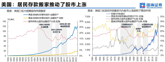 大洋彼岸的美国,确实是存款搬家到股市的典范,从上世纪80年代开始到现在,一共有3波大规模存款搬家,都推动了股市上涨。
