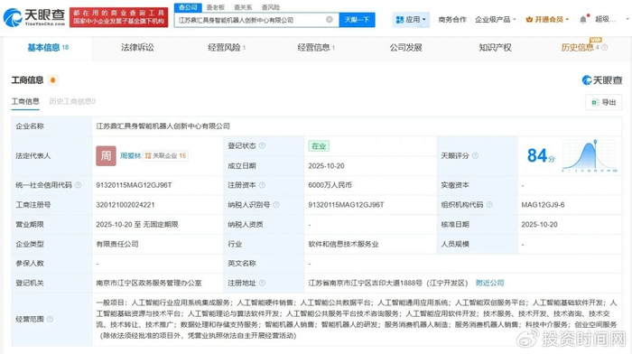 天眼查工商信息显示,近日,江苏鼎汇具身智能机器人创新中心有限公司成立,法定代表人为周爱林,注册资本6000万人民币,经营范围包括人工智能行业应用系统集成服务、人工智能硬件销售、人工智能公共数据平台、人工智能通用应用系统等。