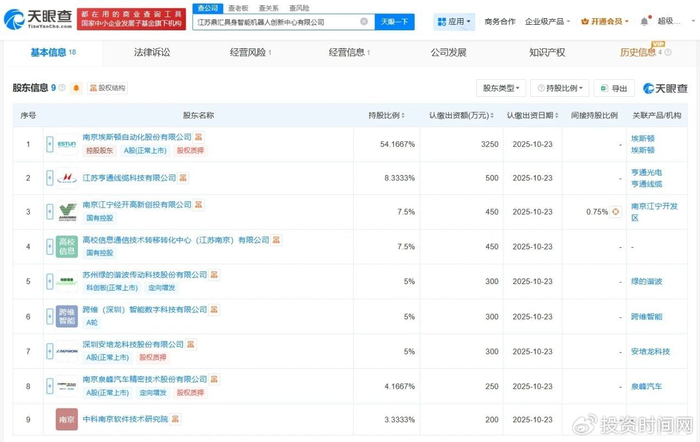 股东信息显示,该公司由埃斯顿(002747)、江苏亨通线缆科技有限公司、绿的谐波(688017)、安培龙(301413)、泉峰汽车(603982)等共同持股。