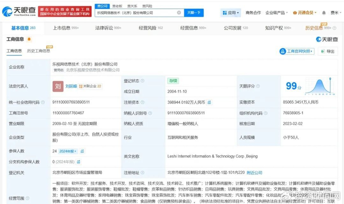 天眼查工商信息显示,乐视网信息技术(北京)股份有限公司成立于2004年11月,法定代表人为刘延峰,注册资本约39.9亿人民币,经营范围包括计算机系统服务、计算机软硬件及辅助设备批发、计算机软硬件及辅助设备零售等。股东信息显示,该公司由贾跃亭、刘弘、毕绍波等共同持股。