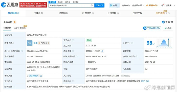 天眼查工商信息显示,近日,国海证券投资有限公司发生工商变更,注册资本由10亿人民币增至15亿人民币,增幅50%,同时部分高管发生变更。