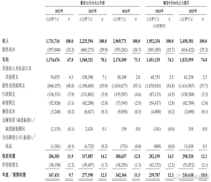 招股书显示,2022年至2024年,丸美生物分别实现收入17.32亿元、22.26亿元、29.70亿元;年度利润分别为1.67亿元、2.78亿元、3.42亿元。今年前九个月,公司收入为24.50亿元,同比增长25.5%;期间利润为2.47亿元,同比增长2.86%,增速较营收大幅滞后。