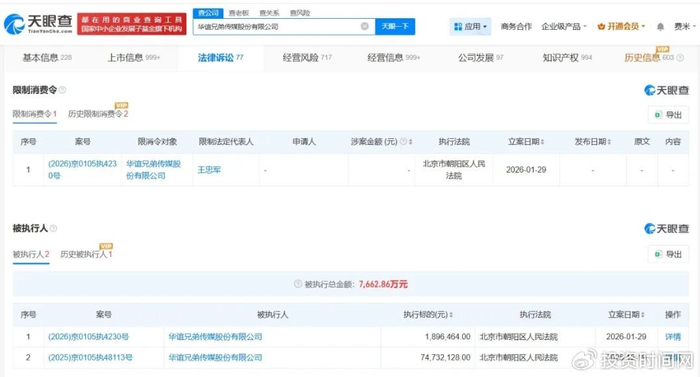天眼查天眼风险信息显示,近日,华谊兄弟(300027)及法定代表人王忠军新增一则限制消费令,执行法院为北京市朝阳区人民法院,案件流程信息显示,此前,该公司已因此案被执行189万余元。