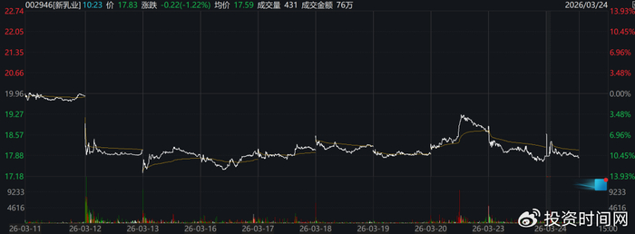 公告发布后,公司A股股价大幅下跌,目前仍未触及20元/股阶段性高点。截至3月24日午盘,新乳业股价收于17.81元/股,总市值约为153亿元。