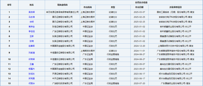 5月23日,中证协官网显示,保荐代表人分类名单D(暂停业务类)目前共有15位保代在列,相较于此前名单,新增了8名保代的信息,涉及6家券商,分别为申万宏源承销保荐的吴杏辉,国元证券的马志涛、徐明,财信证券的蒋序全,广发证券的李佳佳,东吴证券的王新、张琦,中金公司的赵善军。