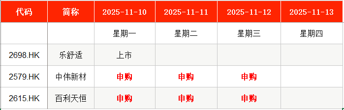 港股方面,Wind数据显示,本周(11月10日至11月13日)中伟新材(02579.HK)、百利天恒(02615.HK)将在周一至周三申购。