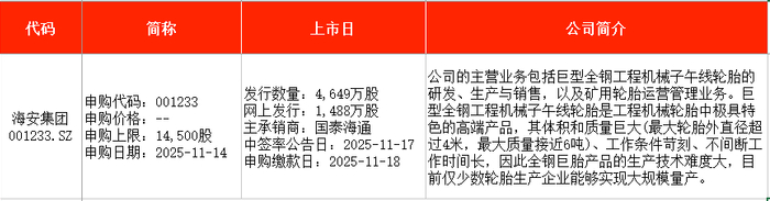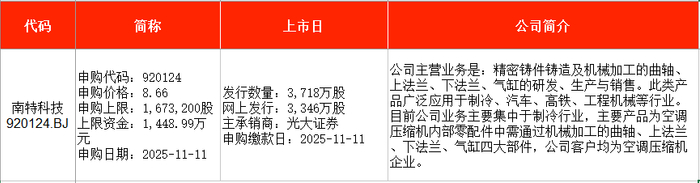 从时间表看,南特科技(920124)将在本周二(11月11日)申购;海安集团(001233)将在本周五(11月14日)申购。