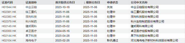 河北海伟电子新材料科技股份有限公司的聆讯通过。中企云链股份有限公司的申请失效。