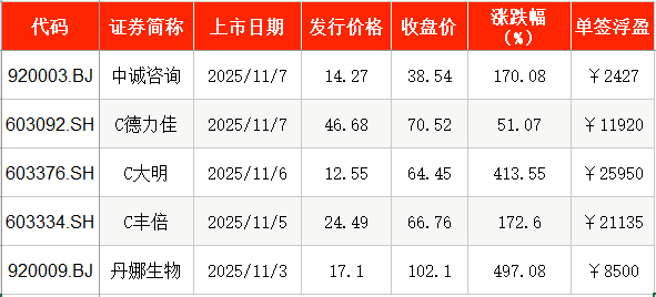 11月7日,中诚咨询在北交所正式挂牌上市,发行价为14.27元/股,截至上市首日收盘,该股报38.54元/股,涨幅为170.08%。以收盘价计算,投资者中一签浮盈为2427元。