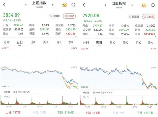 A股三大股指11月21日集体低开,沪指直接跌破3900点。早盘快速下跌,午前跌幅略有收窄。午后短时震荡后重返跌势,尾盘更是跌幅扩大。