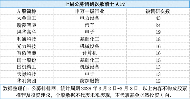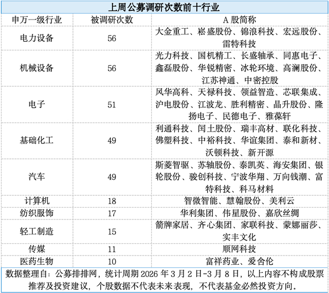 排名第三的是电子行业,上周获得51次公募机构调研,但被调研个股数量达11只,领跑其余行业。其中风华高科(000636)和天禄科技(301045)获得不少于10家公募机构调研关注。