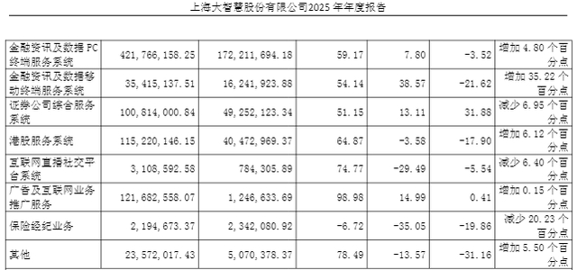 具体到各项业务,大智慧2025年年报资料显示,报告期内,分产品看,公司金融资讯及数据PC终端服务系统产品贡献的收入最多,为4.22亿元。同时,广告及互联网业务推广服务产品、港股服务系统产品、证券公司综合服务系统产品的收入也均超亿元,分别达到1.22亿元、1.15亿元、1.01亿元。