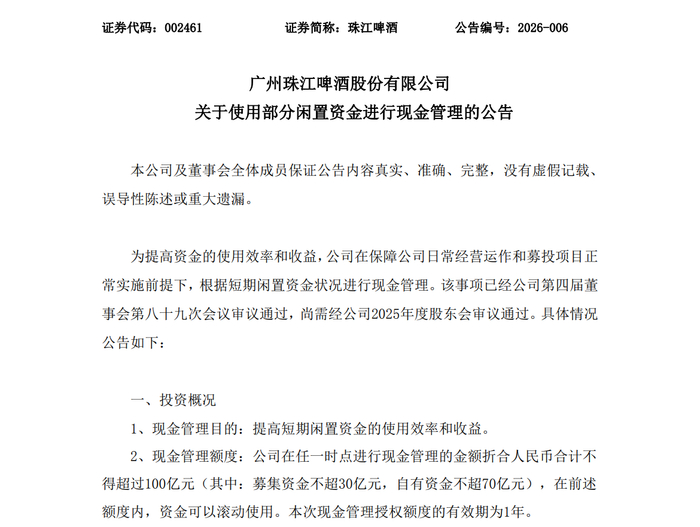 就对公司的具体影响,珠江啤酒表示,公司现金管理资金来源于短期闲置资金,在具体投资决策时,公司将以保障公司日常经营运作和募集资金投资项目建设为前提,并视公司资金情况,决定具体投资期限,同时考虑产品赎回的灵活度,不会影响公司日常生产经营和募集资金投资项目建设,有利于提高短期闲置资金的使用效率和收益。此外,本次事项尚需经公司2025年度股东会审议通过。