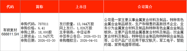 从时间表看,有研复材(688811)、赛英电子(920181)在本周一(3月30日)申购,大普微(301666)则将在本周五(4月3日)申购。