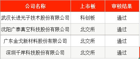 其中,拟在科创板IPO的武汉长进光子技术股份有限公司(下称“长进光子”),以及拟在北交所IPO的沈阳广泰真空科技股份有限公司(下称“广泰真空”)、广东金戈新材料股份有限公司(下称“金戈新材”)、深圳千岸科技股份有限公司(下称“千岸科技”)等均成功过会。